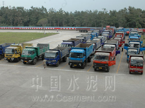 廠區(qū)內(nèi)等候的水泥運(yùn)輸車輛眾多