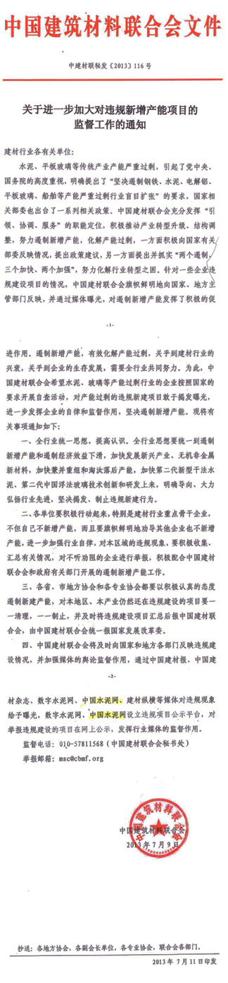 湖北崇陽慧安水泥有限公司以技改名義違規(guī)新建日產(chǎn)4000噸水泥生產(chǎn)線”情況致函國家發(fā)改委和工信部,認(rèn)為:該項(xiàng)目存在違規(guī)擴(kuò)建、未經(jīng)國家發(fā)改委核準(zhǔn)等違規(guī)情況,并函請國家發(fā)改委嚴(yán)肅處理。同時,聯(lián)合會也致函湖北省發(fā)改委和湖北省工信廳,認(rèn)為在湖北省及咸寧市市現(xiàn)有水泥產(chǎn)能已經(jīng)嚴(yán)重過剩,國家和地方正采取措施制止違規(guī)擴(kuò)建水泥項(xiàng)目的形勢下,該項(xiàng)目的建設(shè)顯然不妥。